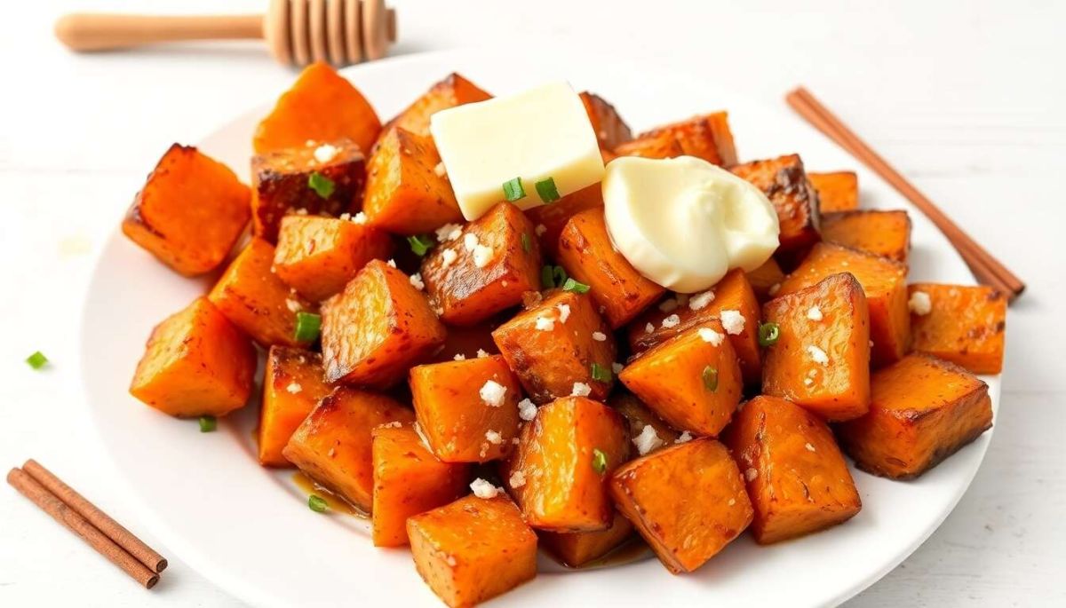 Pour mettre en valeur vos patates douces caramélisées, choisissez un plat en céramique coloré. Utilisez également des fourchettes en inox pour un service élégant et ajoutez une touche rustique à votre table avec un plat en bois.