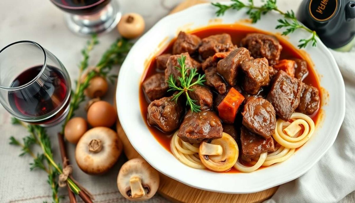Ce plat traditionnel, originaire de la Bourgogne, sublime des morceaux de viande moins tendres grâce à une cuisson lente dans du vin rouge.