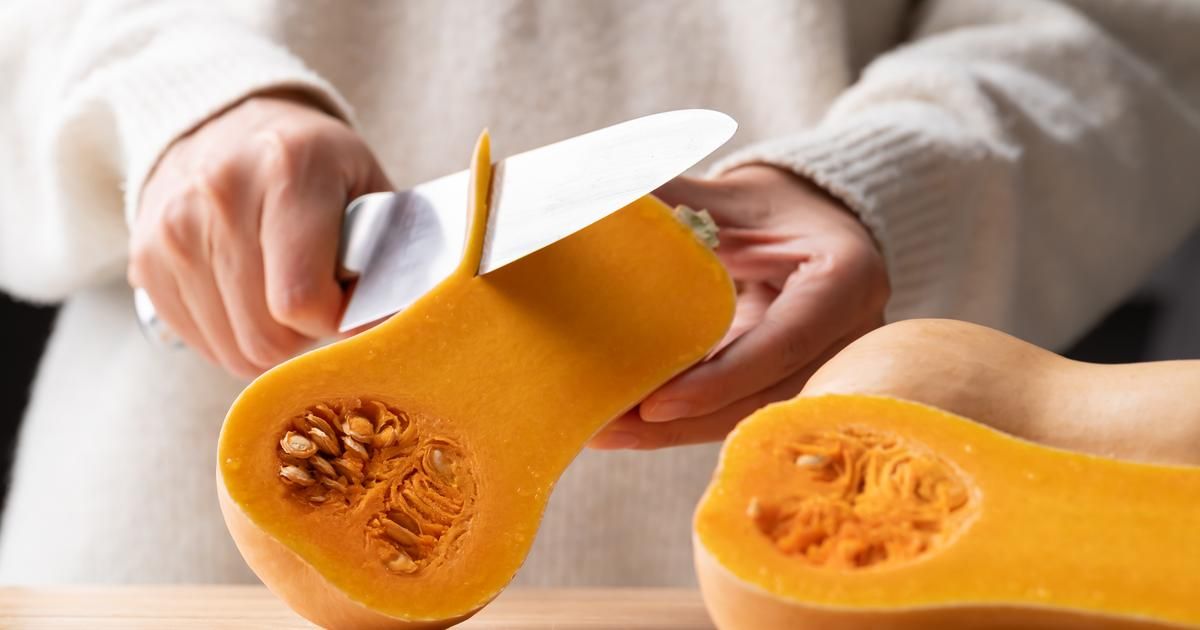 Pour des courges à peau plus épaisse, comme le potimarron, Valérie suggère de les couper en grandes tranches et de les vider avant de procéder à l'épluchage. Un couteau long sera d'une grande aide pour éviter les accidents. Concernant le butternut, elle propose de tronçonner la partie longue en rondelles et de diviser la partie bombée avant de retirer les graines et d'éplucher.