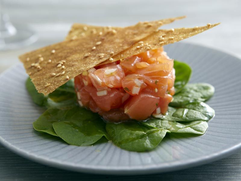 - Tartare de saumon, pousses d'épinard et chips croustillantes : Un plat frais, idéal pour les repas d'été.