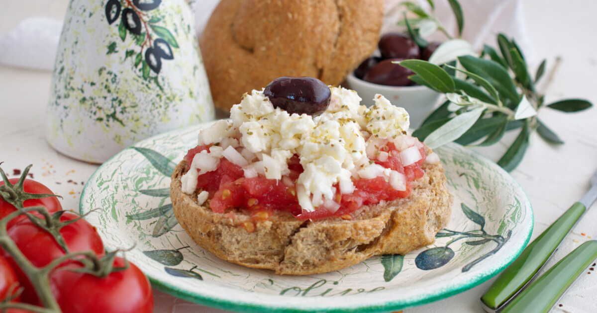Le dakos, populaire sur l’île crétoise, est parfait pour un repas léger, alliant tartine et salade grecque.