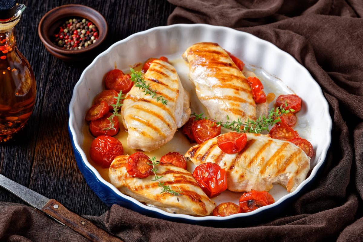 - Ajoutez les tomates cerises et les oignons rouges autour du poulet sur une plaque.