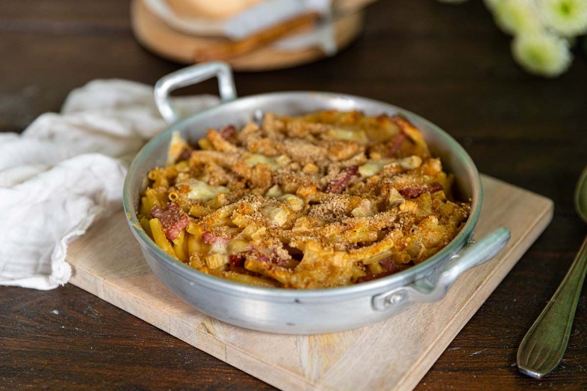 3. Ajoutez les macaronis et les lardons à la sauce, puis transférez le tout dans un plat à gratin. Parsemez de chapelure et du munster restant, puis enfournez pour environ 20 minutes, jusqu'à ce que le gratin soit bien doré.