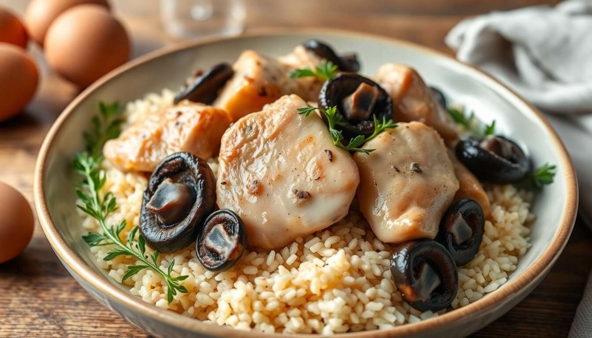 Cet met s'inspire largement de la cuisine asiatique. Les champignons noirs, qui sont des incontournables de nombreuses recettes traditionnelles chinoises, apportent un croquant et une saveur délicate qui se marient parfaitement avec le poulet.