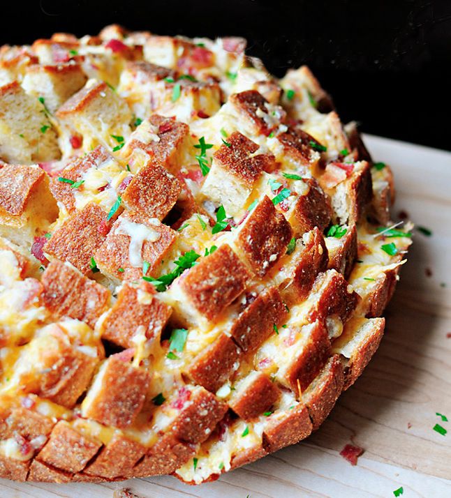 Recette du pain hérisson : Mélangez 20 cl de crème fraîche avec 2 gousses d'ail pressées et 4 c. à s. de ciboulette. Coupez un pain de campagne en tranches sans aller jusqu'au fond, remplissez avec le mélange et ajoutez 100 g de comté. Enfournez 20 minutes à 180°C.